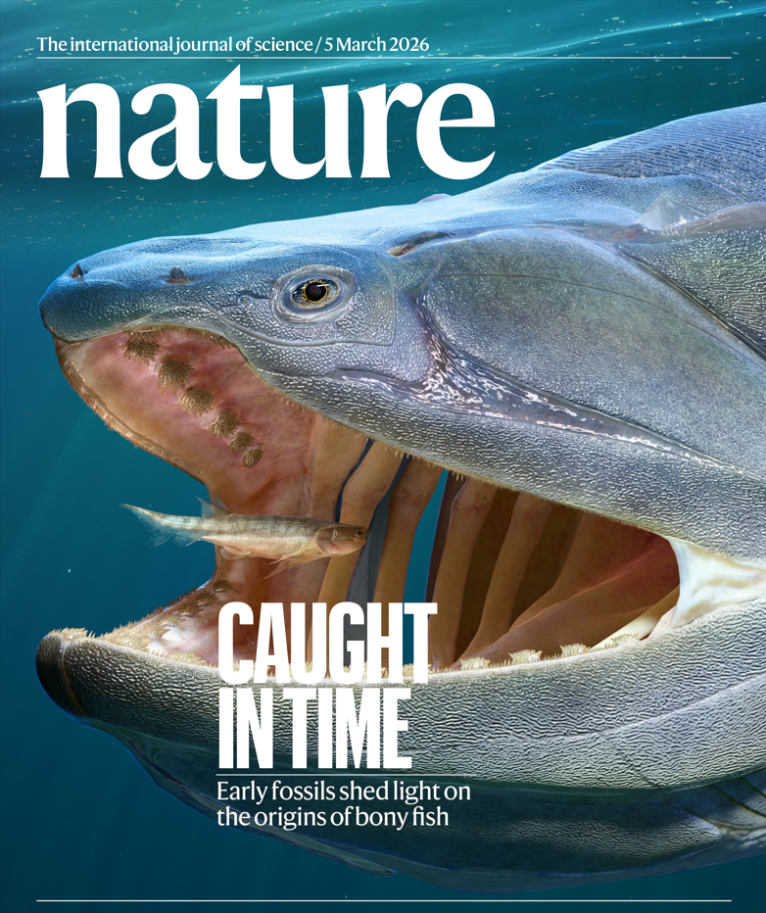 Nature封面。重庆始骨鱼(小鱼)和钝齿宏颌鱼(大鱼)三维复原图。