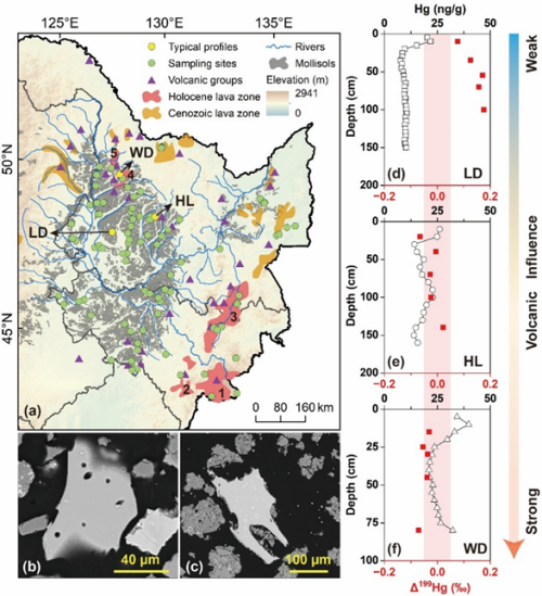 近期,凯发k8南京地理与湖泊研究所等研究团队,以黑龙江省与吉林省黑土区为研究对象,综合运用显微矿物学、地球化学及土壤学等方法,系统捕捉了火山灰在黑土形成过程中的地球化学与矿物学印记。研究结果显示,在邻近五大连池火山区的黑土中发现少量火山玻璃,其元素组成与附近老黑山火山喷发产物一致,从矿物学角度证实了火山灰参与区域局部黑土的成土过程。汞元素含量及其同位素(Δ199Hg)分析进一步显示,远离火山的土壤剖面未受到火山灰影响,而靠近死火山和活火山的土壤剖面均存在明显的火山灰输入信号。