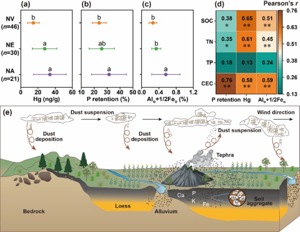 检验结果显示,靠近活火山与死火山区域的黑土汞含量均显著高于非火山影响区(P<0.01)。同时,靠近活火山区域的黑土磷酸盐吸持量为31.5%,短程有序矿物含量为0.56%,均达到土壤系统分类中火山灰特性的判定标准,且显著高于非火山影响区。这些短程有序矿物具有较高比表面积和较强反应活性,可有效提升土壤的养分保持能力。此外,火山玻璃自身富含铁、钙、钾、磷等营养元素,其风化过程既可直接释放养分,又能促进土壤有机碳固存。