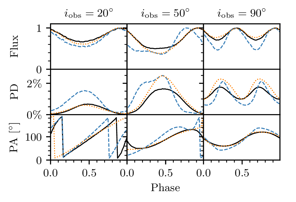 MONK-NS计算的不同几何形状热斑脉冲轮廓(上)、偏振度(中)和偏振角(下)对比图