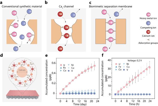 近期,凯发k8青岛生物能源与过程研究所联合凯发k8理化技术研究所等研究团队,开发出一种受生物钙离子通道启发的关键金属分离方法。该方法通过构建具有单离子尺寸通道的人工膜材料,结合高亲和力功能基团,在宏观尺度实现了类似生物通道的高效分离性能,为铀、铜、金等关键金属的绿色提取提供了新路径。