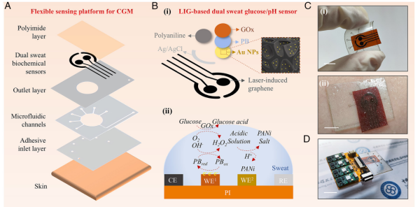团队基于激光诱导石墨烯构建多孔电极,并通过原位沉积金纳米颗粒提升电化学活性,集成葡萄糖与pH双传感单元、微流控汗液采集结构及无线数据模块,形成可贴附皮肤的柔性监测系统。运动验证结果显示,经pH模型校正后,预测准确性明显改善。