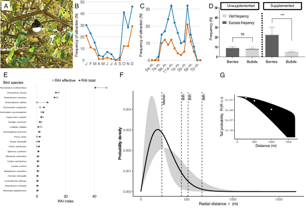 A-C、E红外相机记录下的珠芽被访问的时间规律与访问者组成;D实验室环境下鸟类对珠芽与浆果的选择实验;F-G数学模型中珠芽的扩散距离。