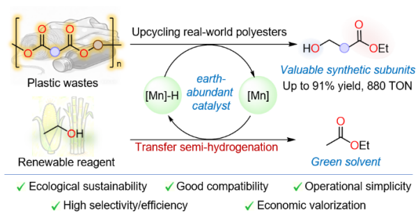 这一方法以锰为催化剂,其用量可低至0.05 mol%,反应条件温和,以生物可再生乙醇为氢源,无需额外使用氢气,操作简便安全。同时,该方法对现实生活中直接回收的多种废弃聚酯材料表现出良好的兼容性,即使其中含有杂质,也不影响降解反应进行。所得产物价值高,可以作为医药、农药和功能材料合成中的重要前体。
